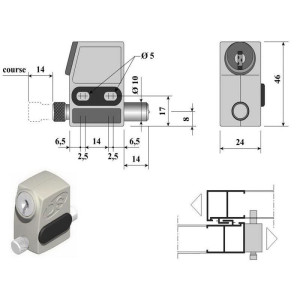 Verrou de condamnation à clef et cale de fixation excentrée pour profil plat CDS pour baie coulissante GRIS